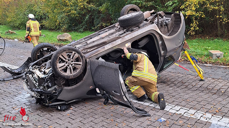 „Beim Eintreffen der Feuerwehr wurde auf einem Rastplatz ein Pkw in Dachlage vorgefunden“ so Benedikt Brinkhaus von der Feuerwehr Greven. Nach ersten Erkenntnissen ist das Fahrzeug von der Straße abgekommen und hat sich im weiteren Verlauf überschlagen. Im Zuge des Unfallhergangs wurden die beiden Fahrzeuginsassen schwer verletzt. „Eine Person befand sich bei unserem Eintreffen bereits außerhalb des Fahrzeuges. Zur Rettung der zweiten Person musste zunächst das Fahrzeug stabilisiert und dann schweres, technisches Gerät eingesetzt“ so Brinkhaus.