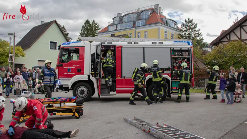 Nach den Worten der Ehrengäste und Feuerwehrkommandanten Philipp Michalek begann der Tag der offenen Türe. Neben den eigenen Feuerwehrfahrzeugen konnten die Besucherinnen und Besucher auch Sonderfahrzeuge der Freiwilligen Feuerwehren Baden – Weikersdorf, Leobersdorf, der Berufsfeuerwehr Wien, der Flughafenfeuerwehr Wien und des Roten Kreuzes Kottingbrunn bestaunen. Die Feuerwehrmitglieder der Bad Vöslauer Feuerwehr ließen es sich auch nicht nehmen, der Bevölkerung zu zeigen, was in ihnen steckt, daher wurde in den Wochen vor dem Fest unter der Leitung von Gruppenkommandanten Daniel Wirth, Fahrmeistergehilfen Alexander Ungerhofer und Ausbilder Roland Schremser, eine spektakuläre Einsatzübung ausgearbeitet.