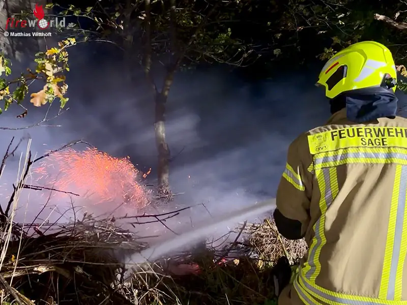 GROSSENKNETEN (DEUTSCHLAND): Am Samstagabend, 1. November 2025, um 19:56 Uhr wurde die Feuerwehr Sage zu einem Brandeinsatz in die Straße Zur Sager Heide alarmiert. Auf einem Privatgrundstück war aus bislang unbekannten Gründen ein Streifen aus Ästen, aufgehäuftem Laub und Gartenabfällen in Brand geraten.
