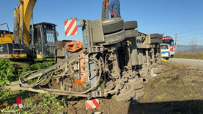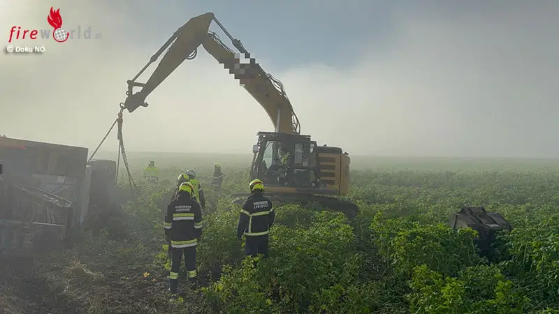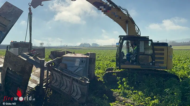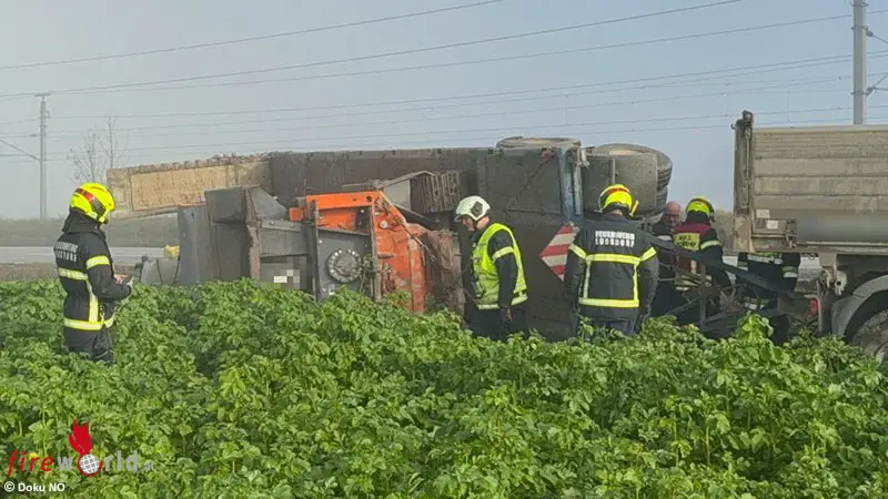 Nö: Lkw-Anhänger mit Arbeitsmaschine in Loosdorf umgestürzt → Bergung per Kettenbagger