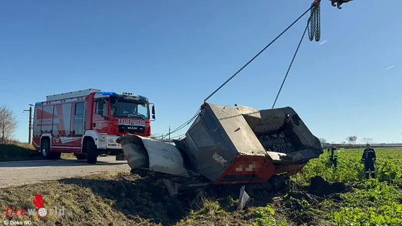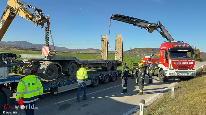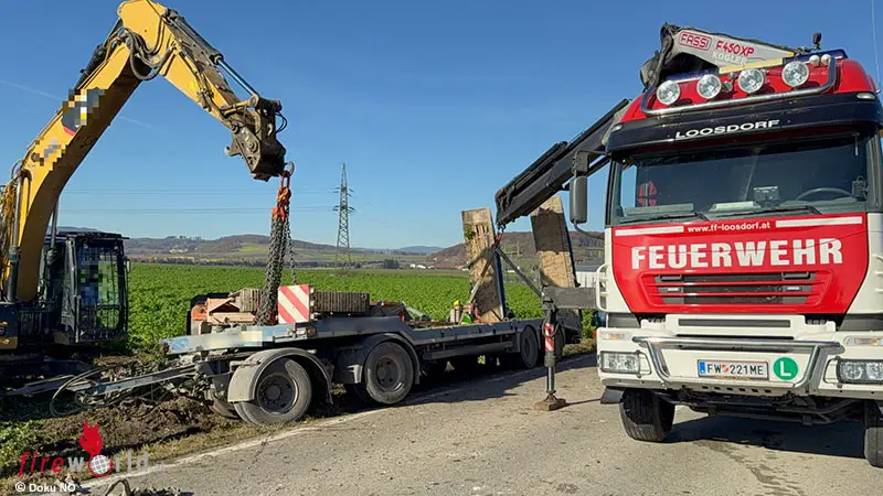LOOSDORF (NÖ): Am Dienstagvormittag, dem 4. November 2025, wurde die Freiwillige Feuerwehr Loosdorf zur Unterstützung bei der Bergung eines umgestürzten Anhängers alarmiert. Auf einer Landesstraße nähe Loosdorf war ein mit einer Arbeitsmaschine beladener Lkw aus bislang unbekannter Ursache seitlich von der Fahrbahn abgekommen.