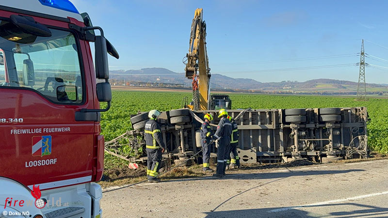 LOOSDORF (NÖ): Am Dienstagvormittag, dem 4. November 2025, wurde die Freiwillige Feuerwehr Loosdorf zur Unterstützung bei der Bergung eines umgestürzten Anhängers alarmiert. Auf einer Landesstraße nähe Loosdorf war ein mit einer Arbeitsmaschine beladener Lkw aus bislang unbekannter Ursache seitlich von der Fahrbahn abgekommen.