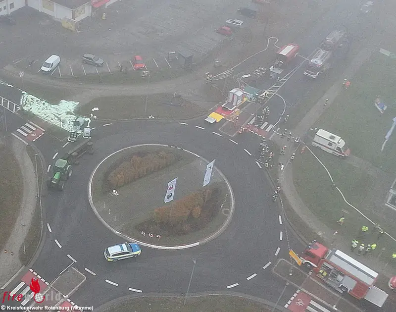 Gegen 10:35 Uhr des 10. November 2025 kam es im Kreisverkehr Nord-West-Ring / Bremervörder Straße in Zeven zu einem Gefahrgutunfall. Eine Person wurde dabei verletzt.