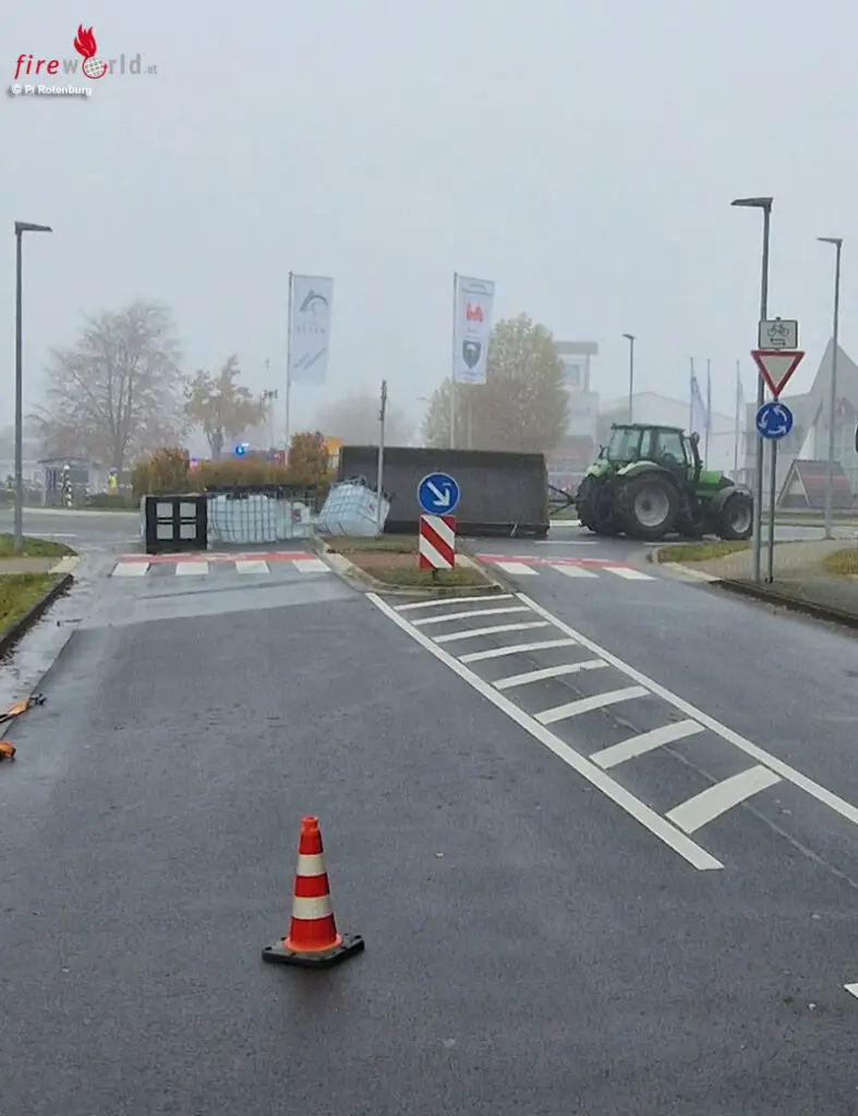 Beim Eintreffen der ersten Kräfte am Kreisel an der B71 lag ein Anhänger eines Taktors im Kreisverkehr auf der Seite. Der Anhänger war mit vier IBC-Containern beladen, die Propionsäure enthielten. Zwei der Behälter waren beschädigt, wodurch größere Mengen Flüssigkeit austraten.
