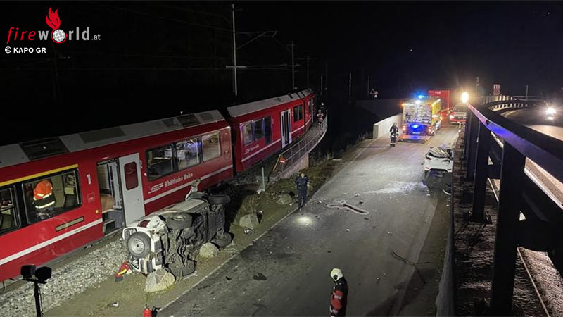 Unterhalb der Stützmauer landete das Fahrzeug auf dem Dach eines abgestellten Autos. Durch die Aufprallwucht schleuderte es das hinuntergestürzte Fahrzeug weiter über die Straße und kam abschließend seitlich liegend nahe den RhB-Geleisen zum Stillstand. Der mittelschwer verletzte Lenker konnte selbständig das Fahrzeug verlassen, bevor kurze Zeit später ein nahender Zug trotz eingeleiteter Notbremsung den Personenwagen noch leicht touchierte.