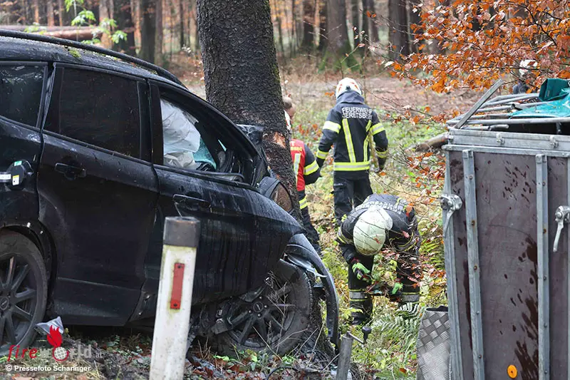 GERETSBERG (Oö): Ein schwerer Verkehrsunfall hat sich Montagnachmittag, 10. November 2025, in Geretsberg (Bezirk Braunau am Inn) ereignet. Ein Pkw samt Anhänger ist von der Straße abgekommen und gegen einen Baum gekracht.