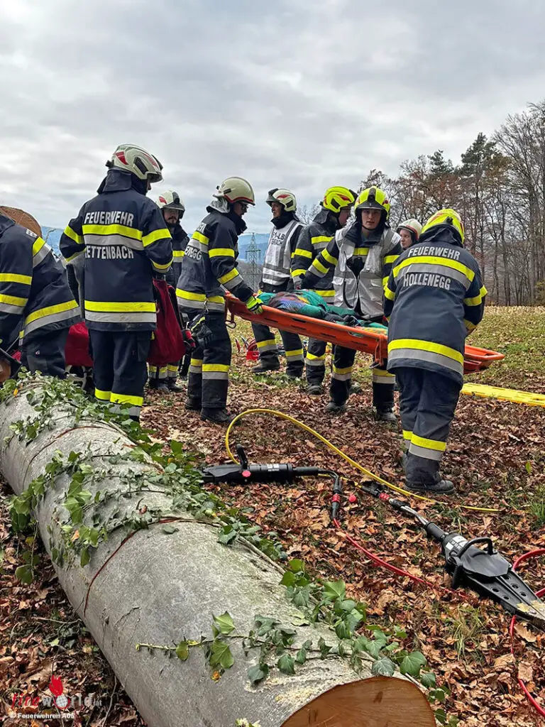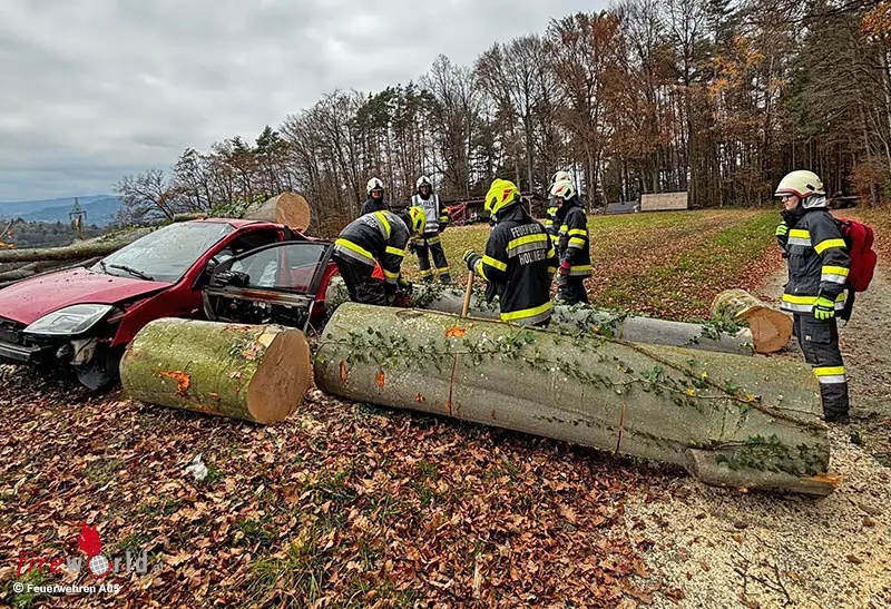 Weiters wurde der auf dem Pkw liegende Baum gesichert und die eingeklemmte Person mittels hydraulischen Rettungsgeräts aus dem Fahrzeug befreit. Parallel dazu waren zwei Wehren beim Holzstapel damit beschäftigt, die unter den Baumstämmen eingeklemmte Person zu befreien.