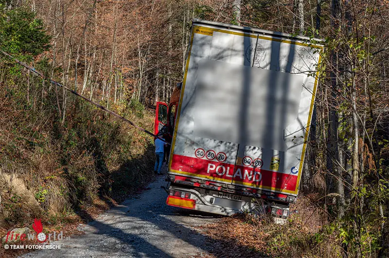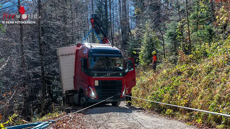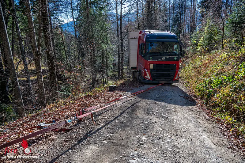 Oö: Aufwendige Bergung eines Sattelzuges auf Waldstraße in Rosenau am Hengstpass