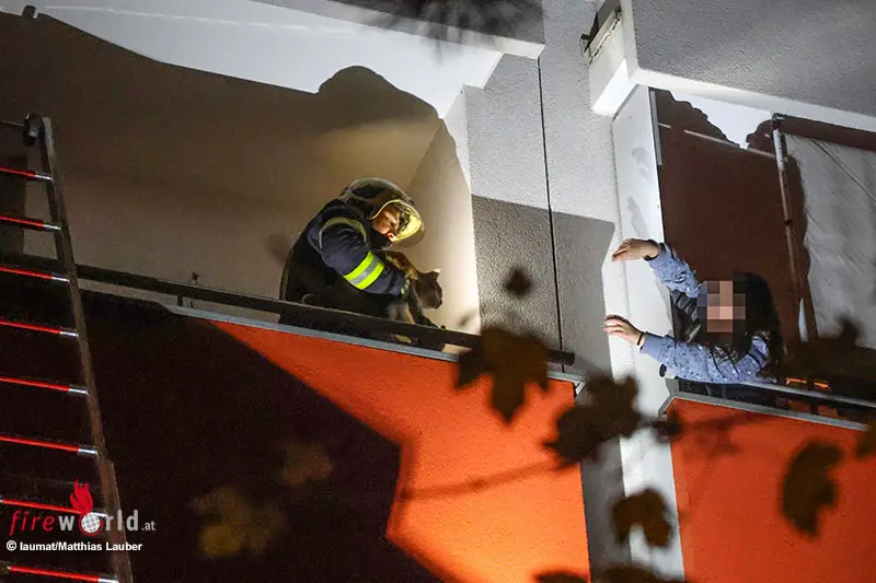 WELS (OÖ): Einen Kater, der auf den Nachbarbalkon gesprungen ist, aber offensichtlich nicht mehr zurück konnte, musste am späten Donnerstagabend, 13. November 2025, von der Feuerwehr in Wels „gerettet“ werden.