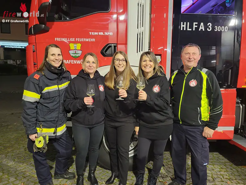 Für die Ankunft zuhause hatte die Grafenwörther Mannschaft dann einen feierlichen Empfang aufgefahren! Eine Menge an Mitgliedern, Familie und interessierten Grafenwörthern erwarteten das Fahrzeug am Feuerwehrhaus mit Pyrotechnik, Getränken und frisch gegrillten Koteletts. Von den Fahrzeugpatinnen Daniela Gmeiner, Verena Schuster und Daniela Heiß wurde außerdem etwas Wein besorgt, weiters haben sich die drei zusammenpassende Pullover machen lassen, um die große Ehre der Fahrzeugpatenschaft auch nach außen zu tragen.