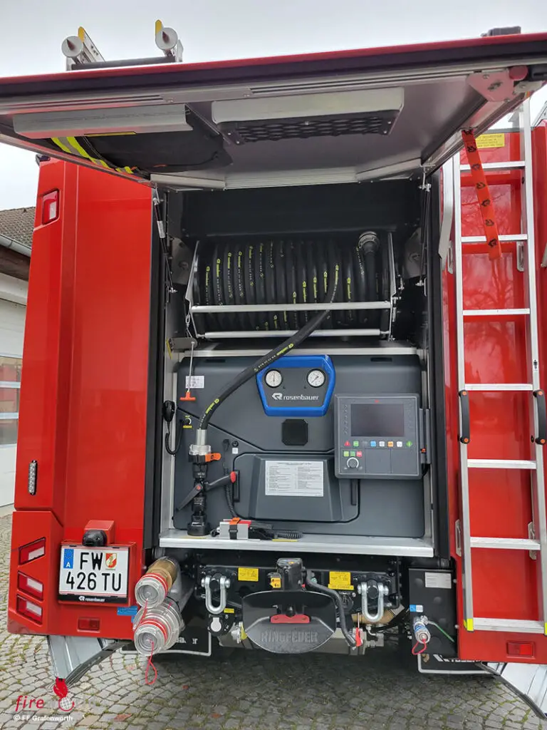 Zur Bekämpfung von Bränden können Schläuche an insgesamt fünf Druckabgängen angeschlossen werden – vier seitlich und einer an der Front. Zusätzlich steht ein formstabiler Schlauch auf einer Schnellangriffseinrichtung im Heck bereit. Im Gegensatz zur Vorgängerfahrzeug ist keine Hochdruckpumpe mehr verbaut, was die Ausbildung etwas vereinfacht und obendrein Geld spart. Am Dach kann ein Wasserwerfer mit einer Leistung von max. 2.400l/min angeschlossen werden, zusätzlich ist eine klassische Schaumausrüstung für Mittel- und Schwerschaum mit an Bord.
