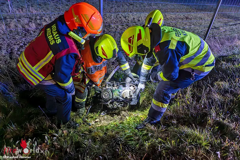 Das Fahrzeug der entgegenkommenden Familie aus Krems wurde in Fahrtrichtung Krems in den rechten Straßengraben geschleudert. Ein nachfolgender Fahrzeuglenker befand sich mit einem Pkw unmittelbar hinter dem Fahrzeug der Familie aus Krems. Er konnte durch ein Auslenkmanöver einen Zusammenstoß mit den Unfallfahrzeugen verhindern, touchierte jedoch denauf der Fahrbahn liegenden Motorblock. Er blieb unverletzt.