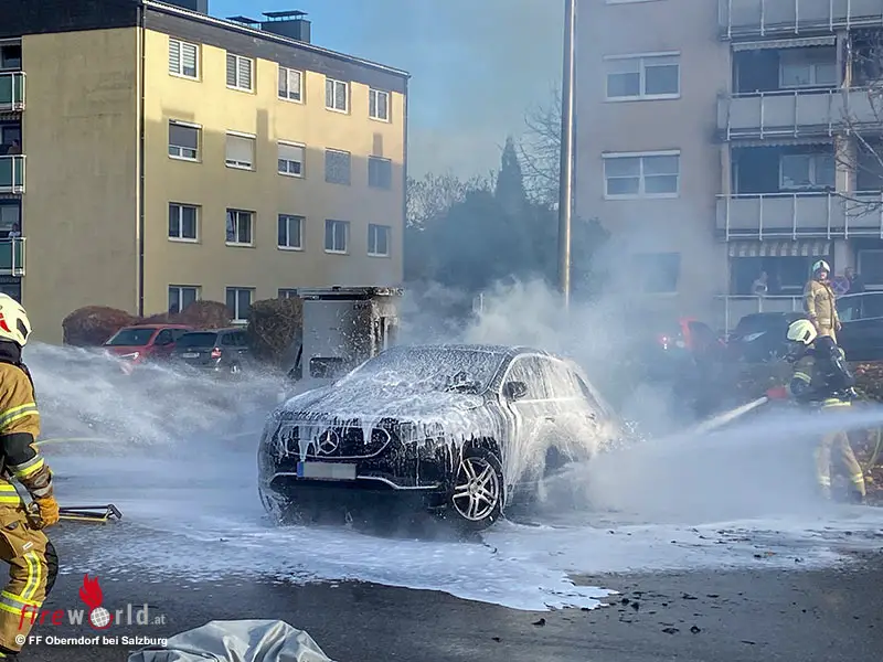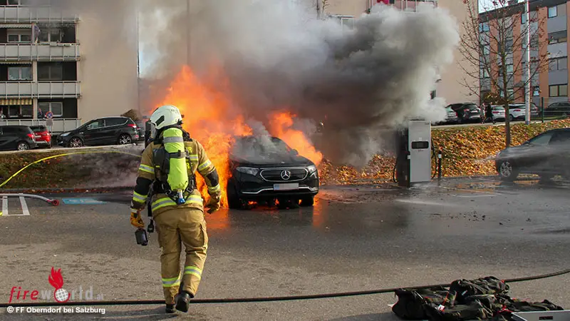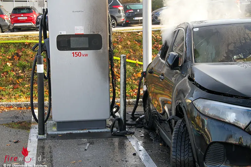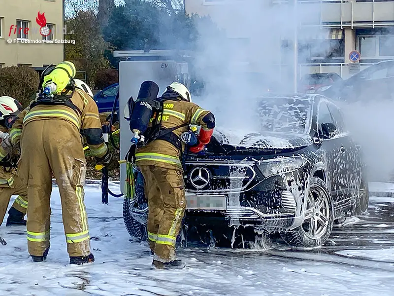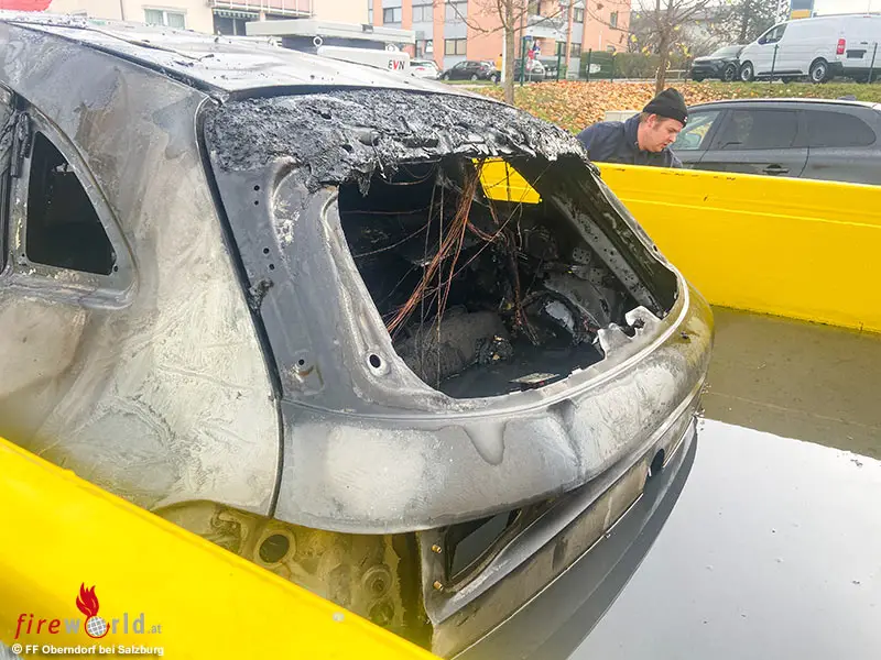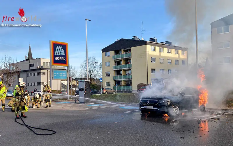 OBERNDORF BEI SALZBURG (SBG): Um 09:12 Uhr des 16. November 2025 wurde die FF Oberndorf bei Salzburg zu einem Fahrzeugbrand auf den Parkplatz der Hofer-Filiale in Oberndorf gerufen. Bereits in der Alarmierung wurde mitgeteilt, dass es sich um ein Elektrofahrzeug handelt.