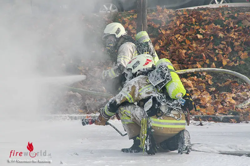 Mittels der anrückenden Atemschutztrupps wurde umgehend die Brandbekämpfung mit zwei C-Rohren sowie einem Hochdruckrohr begonnen. Zeitgleich wurde eine Vollsperrung der Salzburger Straße B156a seitens der Polizei vorgenommen und eine örtliche Umleitung eingerichtet.