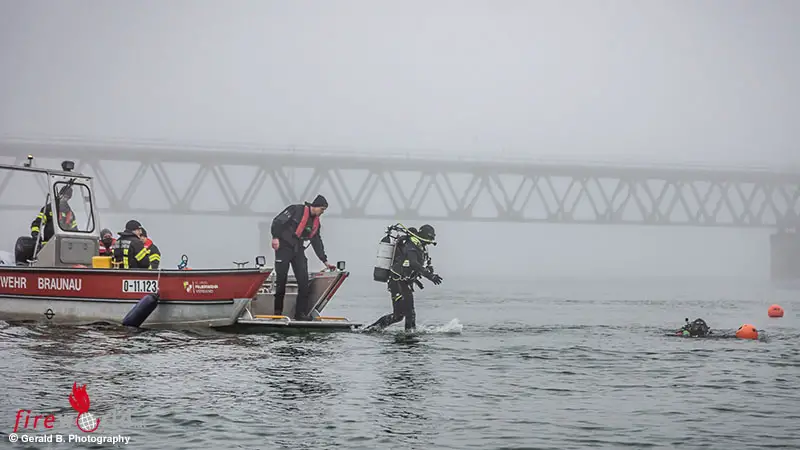 Insgesamt nahmen 13 Einsatztaucher an der Übung teil, davon acht im aktiven Wassereinsatz. Unterstützt wurden sie durch zwei Arbeitsboote der Feuerwehren Braunau und St. Peter, sowie das Rettungsboot der Feuerwehr St. Peter.