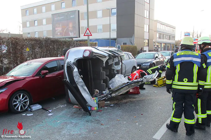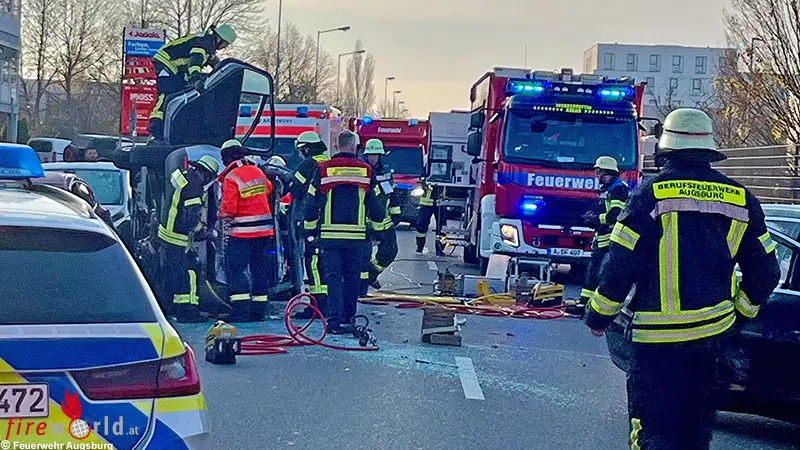 AUGSBURG (BAYERN): Gegen 09:15 Uhr wurde die Berufsfeuerwehr Augsburg am 19. November 2025 zu einem Verkehrsunfall in die Eichleitnerstraße gerufen. Eine verletzte Person befand sich im verunfallten Pkw, der auf der Fahrzeugseite lag.