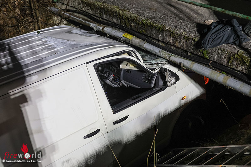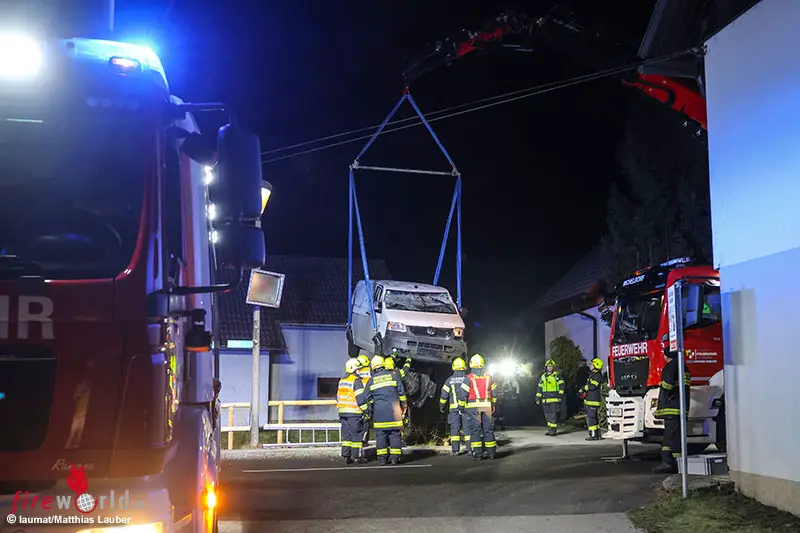 Die Einsatzkräfte zweier Feuerwehren wurden zur Personenrettung an die Einsatzstelle gerufen, ebenso Rettung, Notarzt und Polizei. Die Einsatzkräfte mussten den Lenker, der im Fahrzeug eingeschlossen war, befreien. Die verletzte Person wurde nach notärztlicher Erstversorgung ins Krankenhaus gebracht. Die Feuerwehr führte anschließend mit einem Kranfahrzeug die Bergung des verunfallten Transporters aus dem Bachbett durch.