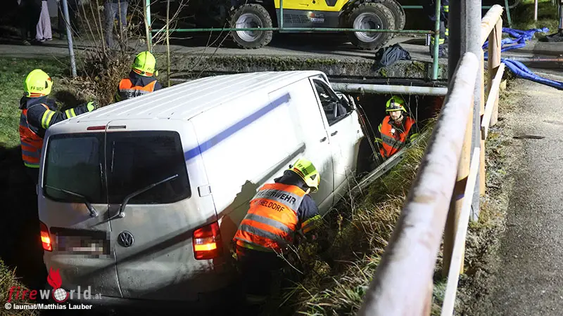Die Einsatzkräfte zweier Feuerwehren wurden zur Personenrettung an die Einsatzstelle gerufen, ebenso Rettung, Notarzt und Polizei. Die Einsatzkräfte mussten den Lenker, der im Fahrzeug eingeschlossen war, befreien. Die verletzte Person wurde nach notärztlicher Erstversorgung ins Krankenhaus gebracht. Die Feuerwehr führte anschließend mit einem Kranfahrzeug die Bergung des verunfallten Transporters aus dem Bachbett durch.