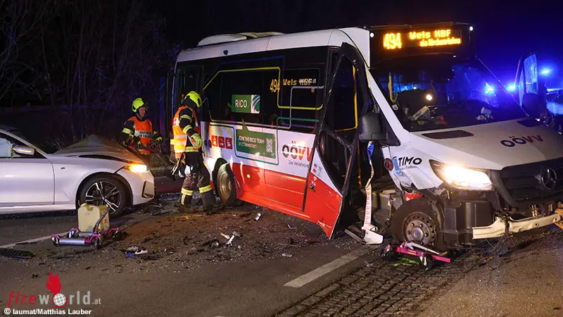 THALHEIM BEI WELS (OÖ): Eine Kollision zwischen einem Linienbus und einem Pkw in einem Kreuzungsbereich der B138 Pyhrnpass Straße in Thalheim bei Wels (Bezirk Wels-Land) endete Dienstagabend, 18. November 2025, mit zwei Verletzten.