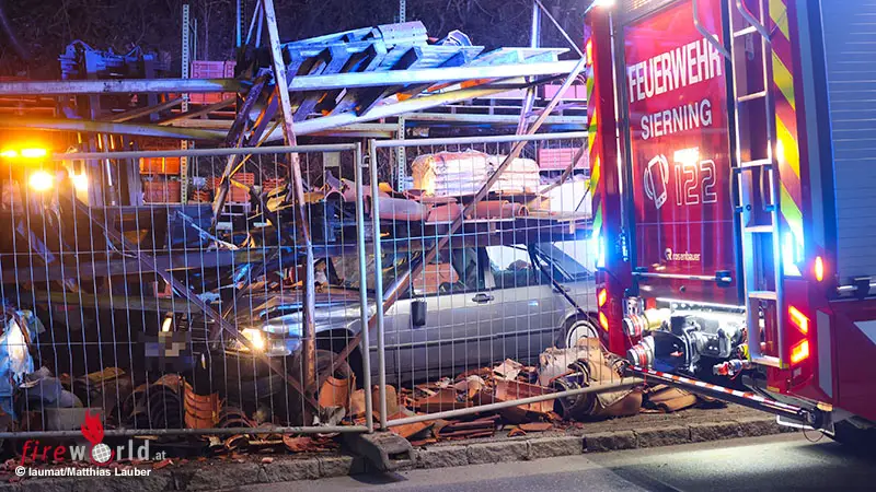 SIERNING (OÖ): In Sierning (Bezirk Steyr-Land) ist am Mittwochnachmittag, 19. November 2025, ein Autolenker mit seinem Wagen von der Straße abgekommen und in ein Regal auf einem Lagerplatz eines Dachdeckerbetriebes gekracht.