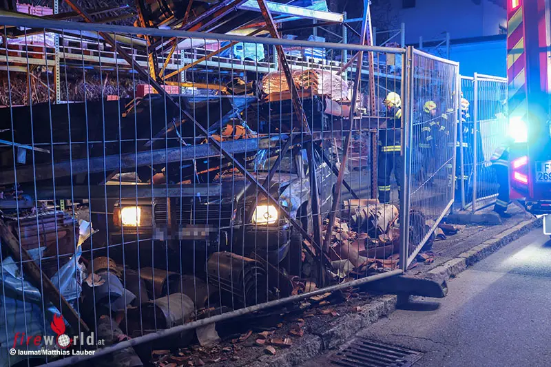 Oö: Pkw kracht in Regal auf Lagerplatz eines Dachdeckerbetriebes → Lenker reanimiert
