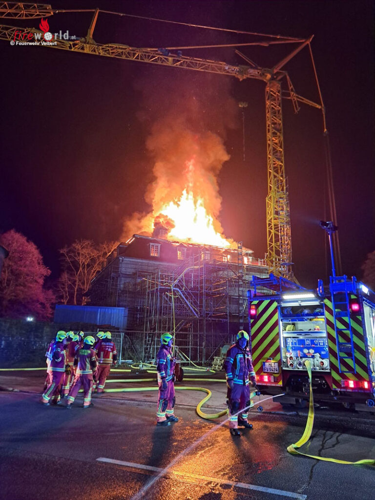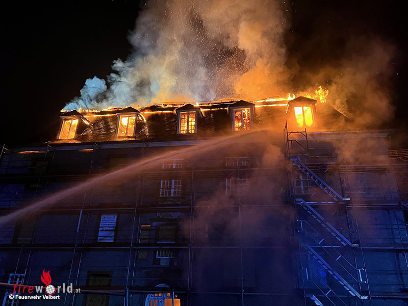 Direkt wurden Löschmaßnahmen über eine Drehleiter sowie ein Innenangriff über den vorderen Bereich des Gebäudes eingeleitet. Aufgrund einer schnellen massiven Ausbreitung des Feuers mussten der Innenangriff kurze Zeit später abgebrochen werden. Kurze Zeit später stand der Dachstuhl komplett im Vollbrand. Die Einsatzleitung alarmierte Kräfte aus allen drei Stadtteilen und bildete insgesamt vier Abschnitte.