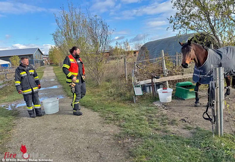 Um die ca. 20 Pferde vor Ort mit Wasser versorgen zu können, rückte daraufhin die Feuerwehr mit ihrem Hilfeleistungsfahrzeug 3 (mit einem 4.000l Wassertank an Bord) zum Hilfseinsatz aus. Vor Ort wurden dann mehrere Behälter mit Wasser befüllt.