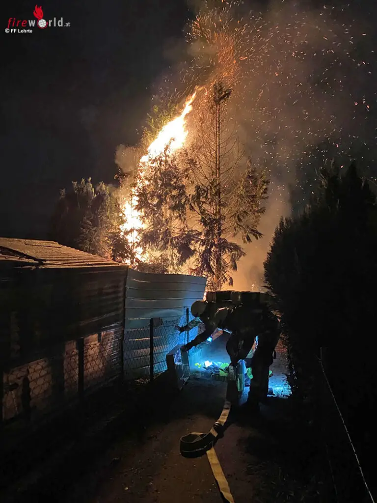 Bereits auf der Anfahrt zur Einsatzstelle konnten die ersten Kräfte hellen Flammenschein in der Gartenkolonie erkennen. Vor Ort stellte sich die Lage dann jedoch nicht als Laubenbrand heraus, sondern in einer Kleingartenparzelle brannten mehrere Nadelbäume, die als Hecke am vorderen Zaunbereich gepflanzt waren.