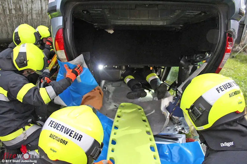 Des Weiteren wurde eine Bereitstellungsfläche mit technischem Gerät vorbereitet. Nach Eintreffen der Feuerwehr Aichdorf (FF mit Hydraulischen Rettungssatz), übernahmen die Kameraden die aufwendige u. komplizierte Menschenrettung des am Dach liegenden Fahrzeuges. Beim zweiten Fahrzeug wurde die Menschenrettung von beiden Wehren gemeinsam durchgeführt.