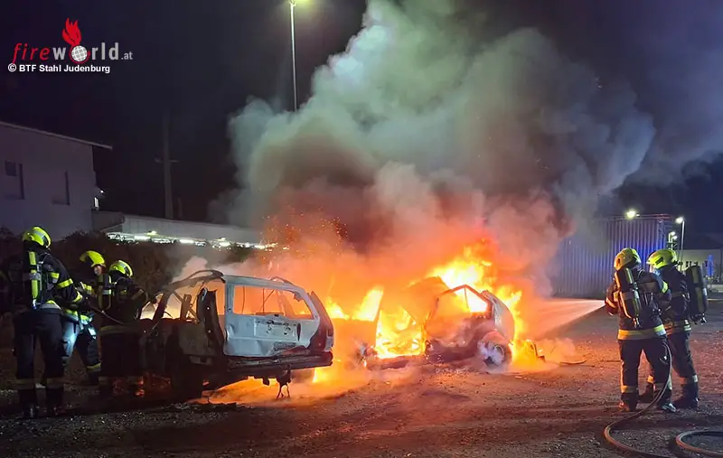 Knapp nach 22:00 Uhr bereits die nächste Alarmierung – Grund war ein Fahrzeugbrand im Westwerk. Am Einsatzort wurden zwei PKW in Vollbrand vorgefunden. Dieser Einsatz wurde gemeinsam mit der Feuerwehr Zeltweg abgearbeitet.