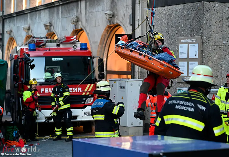 MÜNCHEN (BAYERN): Eine Frau ist am Sonntagnachmittag, 23. November 2025, von der Feuerwehr München gerettet worden. Aufgrund eines medizinischen Notfalls musste sie von der Aussichtsplattform des Alten Peter abgeseilt werden.