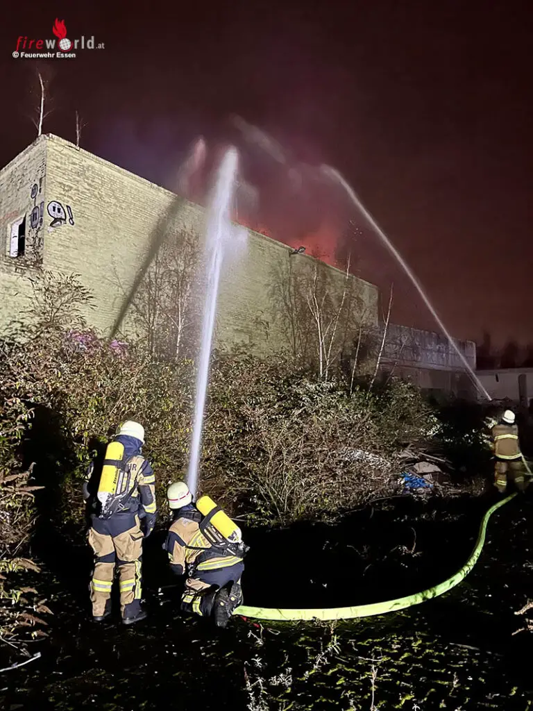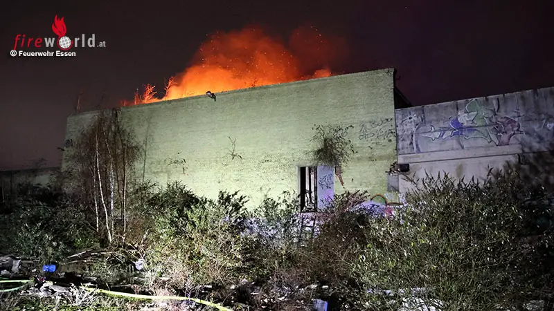 D: Schwer erreichbarer Brand in leerstehender Industriehalle sorgt für stundenlangen Großeinsatz in Essen