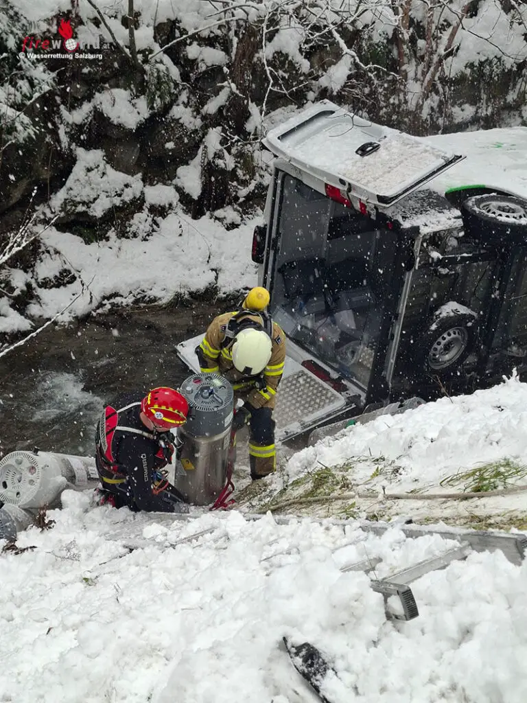 Die Feuerwehr St. Martin sicherte die Unfallstelle umgehend ab. Zur Unterstützung bei den Arbeiten im Gewässer wurde die Wasserrettung Bischofshofen und Altenmarkt hinzugezogen. Die Bergung des verunfallten Transporters aus dem Bachbett erfolgte anschließend in enger Zusammenarbeit mit einem Bergeunternehmen.