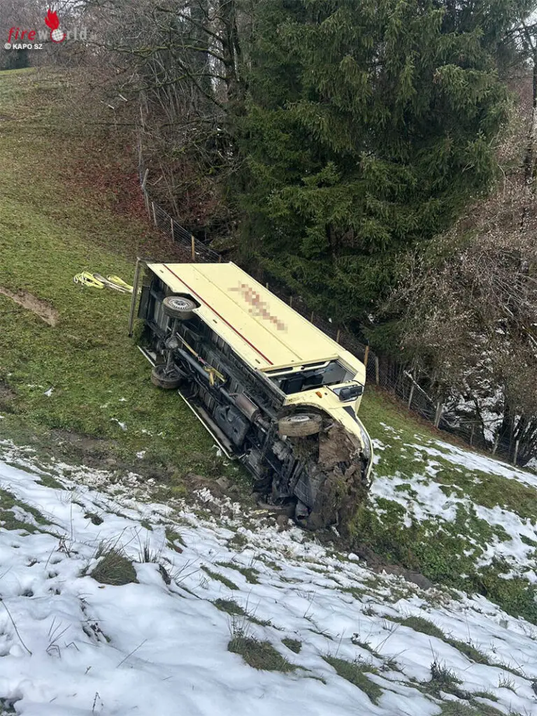 VORDERTHAL (SCHWEIZ): Am Dienstagvormittag, dem 25. November 2025, rutschte ein Lieferwagen in Vorderthal einen Abhang hinunter. Der abgesprungene Lenker blieb unverletzt, doch das Fahrzeug erlitt Totalschaden.