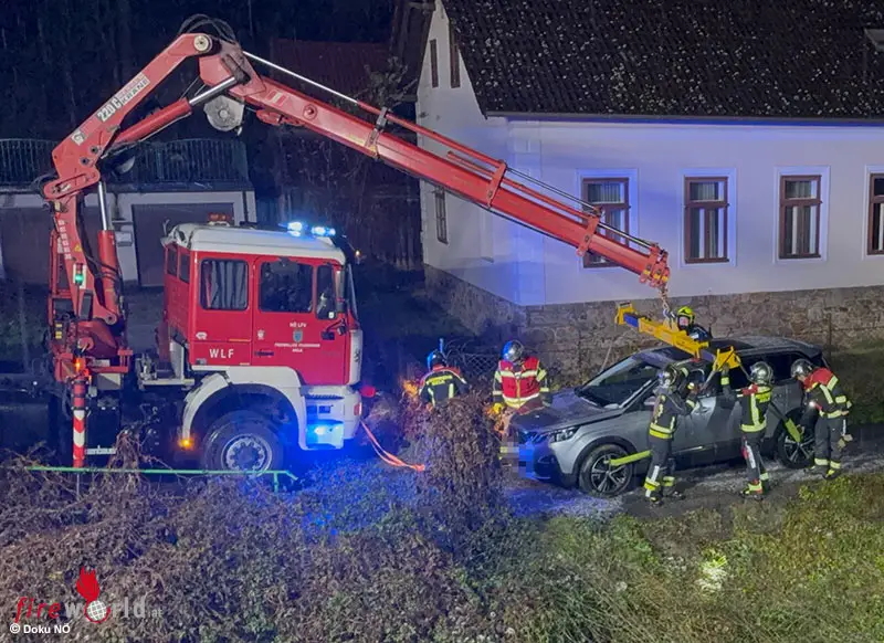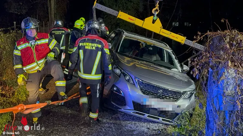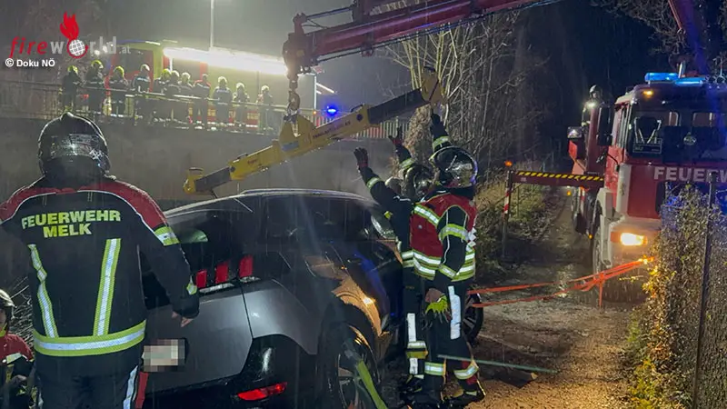 Für eine schonende Bergung wurde anschließend die Feuerwehr Melk mit dem Wechselladefahrzeug-Kran nachalarmiert. In enger Zusammenarbeit gelang es, das Fahrzeug behutsam anzuheben und wieder auf der Fahrbahn abzusetzen.