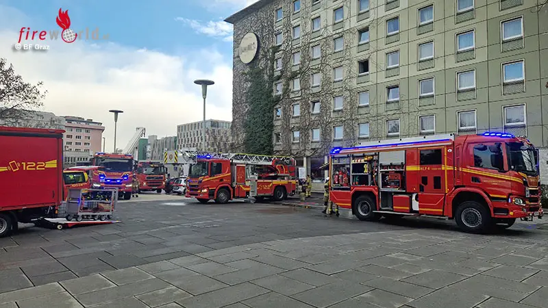 GRAZ (STMK): Die Berufsfeuerwehr Graz ist um 09.38 Uhr des 26. November 2025 durch eine automatische Brandmeldeanlage zu einem Brandereignis alarmiert worden. Eine Löschgruppe der Zentralfeuerwache wurde daraufhin zu der Einsatzstelle (Hotel Europaplatz) alarmiert.