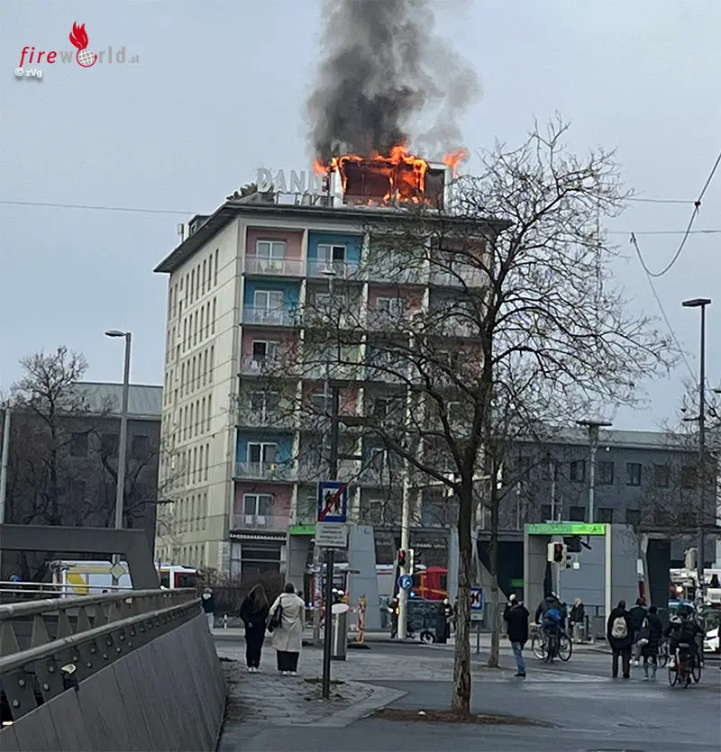 Im Zuge der Erkundung wurde festgestellt, dass vom anwesenden Hotelpersonal bereits das fünfte und sechste Obergeschoss evakuiert wurde und der am Dach befindliche LoftCube in Vollbrand stand. Bereits um 10.04 Uhr konnte die Berufsfeuerwehr Brand aus vermelden. Seitens der Berufsfeuerwehr wurden zwei C-Rohre – über einen Wandhydranten sowie über das Treppenhaus – vorgenommen. Zusätzlich wurde über die Drehleiter ein Außenangriff vorgenommen.