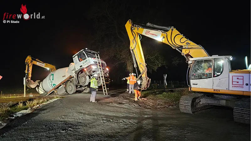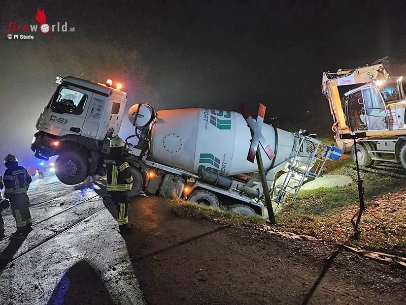 KUTENHOLZ (DEUTSCHLAND): Kurz nach 06:00 Uhr morgens ist in Kutenholz am 27. November 2025 auf der Straße Binnenweide ein Beton-LKW von der Fahrbahn abgekommen. Der 63-jährige Fahrer des Fahrzeuges aus Ahlerstedt war beim Rangieren an einer dortigen Baustelle in den Seitenraum geraten und dann rückwärts in einen Graben gerutscht.
