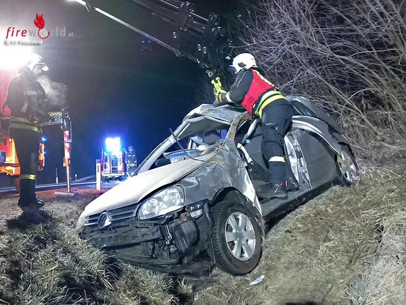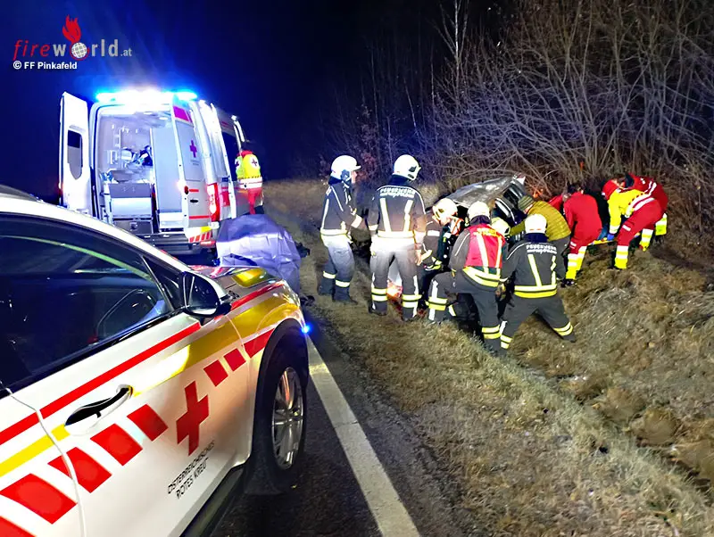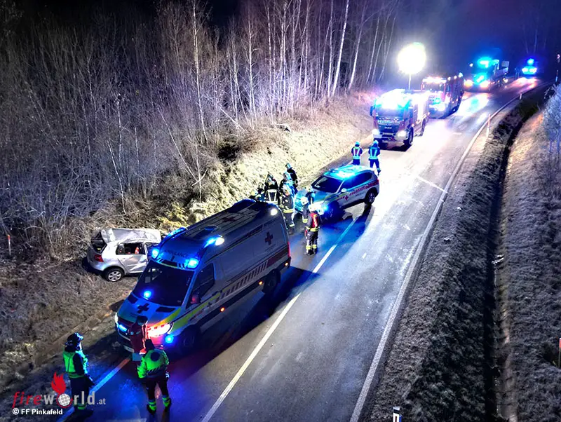 Die Feuerwehr Pinkafeld rückte mit einem ELF (Einsatzleitfahrzeug), einem SRF (schweres Rüstfahrzeug), einem RLF (Rüstlöschfahrzeug), einem WLF (Wechselladerfahrzeug) und 20 Mann zum Einsatz aus. Ein Pkw war aus ungeklärter Ursache von der Fahrbahn abgekommen, überschlug sich mehrmals und kam nach einem wuchtigen Aufprall im Graben zum Liegen.