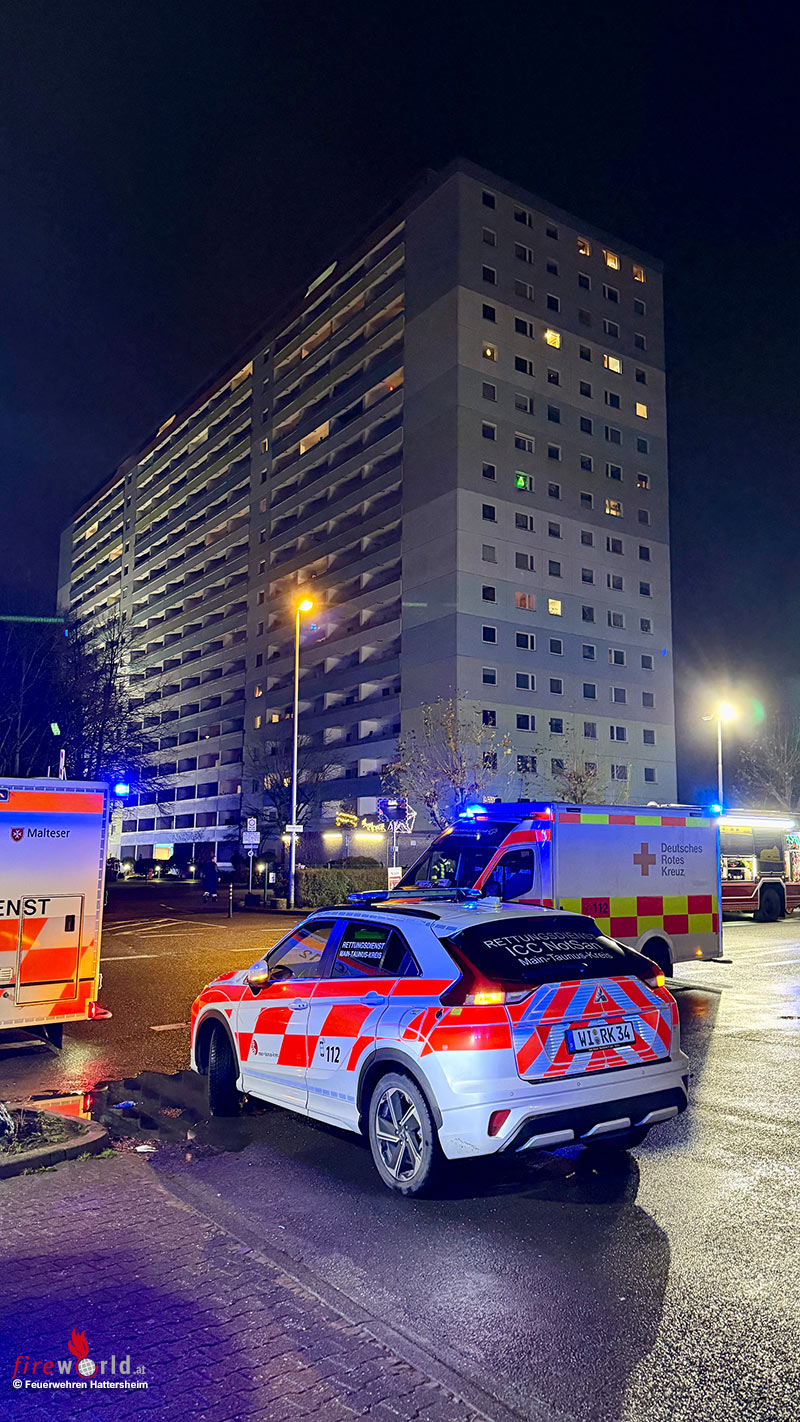 HATTERSHEIM AM MAIN (DEUTSCHLAND): Am Samstagabend, 29. November 2025, kam es in der Sindlinger Straße in Hattersheim-Okriftel zu einem größeren Feuerwehr- und Rettungsdiensteinsatz. Gegen 20:55 Uhr wurde ein Wohnungsbrand im 15. Obergeschoss eines Hochhauses gemeldet, bei dem sich mehrere Personen nicht selbstständig in Sicherheit bringen konnten.