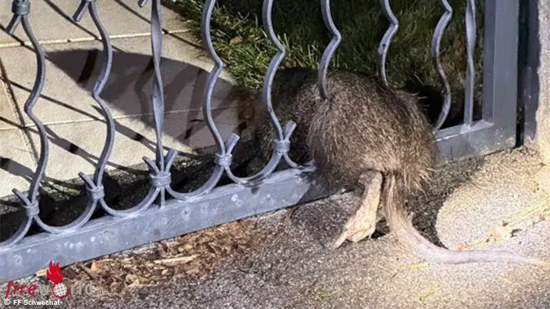 Bei der Garageneinfahrt eines Einfamilienhauses war einem Nutria das Einfahrtstor zum Verhängnis geworden. Das Tier hatte versucht, durch die Gitterstäbe zu schlüpfen, blieb jedoch stecken und konnte sich aus eigener Kraft nicht mehr befreien.