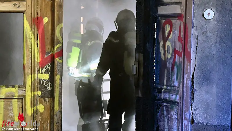 Das Feuer im Eingangsbereich konnte rasch soweit zurückgedrängt werden, dass die Einsatzkräfte in das Gebäude vordringen konnten. Dort wurde eine verletzte Person gefunden und an die Berufsrettung Wien, die mit der Sondereinsatzgruppe im Einsatz war, übergeben. Nach notfallmedizinischer Versorgung wurde sie ins Krankenhaus gebracht. Weitere Atemschutztrupps kontrollierten gleichzeitig das Stiegenhaus sowie sämtliche Wohnungen. Dabei wurde eine verstorbene Person entdeckt. Weitere Bewohner wurden nicht