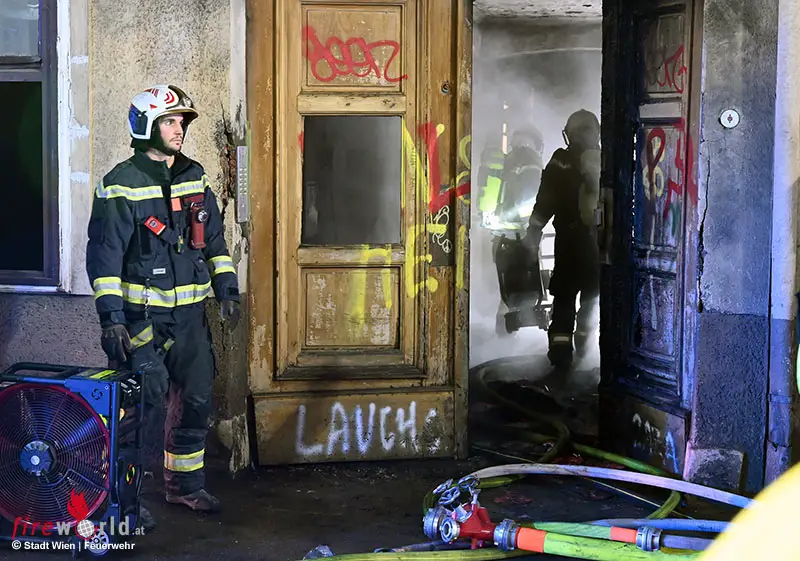 Die Berufsfeuerwehr Wien wurde gegen 19:30 Uhr in die Bergsteiggasse in Wien – Hernals alarmiert. Beim Eintreffen drang bereits dichter Rauch aus den Fenstern und hinter der Eingangstür stand der Bereich in Vollbrand. Die Feuerwehrleute nahmen unverzüglich eine Löschleitung unter Atemschutz vor, um den Brand einzudämmen. Parallel dazu kontrollierten Einsatzkräfte über die Drehleiter die Wohnungen durch die Fenster auf anwesende Personen. Aufgrund der starken Brandentwicklung im Stiegenhaus wurde schon zu Beginn Alarmstufe 2 ausgelöst.