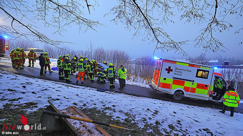 Der Verletzte konnte mit seinem Handy selbst noch eine Bekannte anrufen, die sich dann auf die Suche machte, die Unfallstelle fand und bei der Leitstelle Traunstein einen Notruf absetzte, die sofort die Freiwilligen Feuerwehren Weißbach und Inzell und das Reichenhaller Rote Kreuz mit Rettungswagen, Notarzt und Einsatzleiter losschickte. Die Einsatzkräfte sicherten den Wagen aufgrund des Gefälles per Greifzug am Feuerwehrauto, konnten ihn dann sicher mit dem Hebekissen anheben und so den unterkühlten und nach erster Einschätzung schwer verletzten, aber ansprechbaren Fahrer befreien, den das Rote Kreuz dann nach notärztlicher Erstversorgung ins Klinikum Traunstein einlieferte.