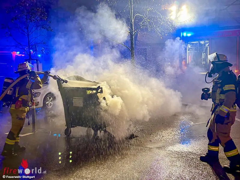 Bereits wenige Minuten zuvor, gegen 21:05 Uhr alarmierten Anwohner die Feuerwehr Stuttgart aufgrund einer brennenden Mülltonne an einer Hausfassade in die Johannesstraße in Stuttgart-West. Die Bewohner reagierten sehr gut und schoben die Mülltonne vom Gebäude weg. Bei Eintreffen der Feuerwehr stand die Mülltonne auf der Straße in Vollbrand. Der Brand konnte von einem Atemschutztrupp mit einem Löschrohr schnell gelöscht werden.