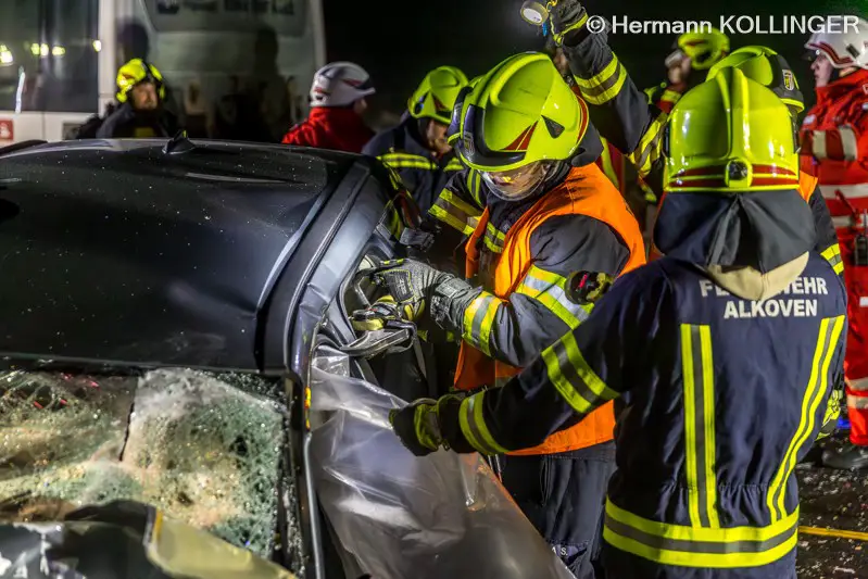 Im Zuge des Berufsverkehrs staute es bei Alarmierung der Einsatzkräfte bereits bis zum Feuerwehrhaus Alkoven zurück, so dass die gesamte Anfahrt auf der B 129 auf der Gegenfahrbahn vorzunehmen war, was jedoch aufgrund der Unpassierbarkeit der Unfallörtlichkeit nahezu reibungslos möglich war. Vor Ort befanden sich einige Personen mit leichten Verletzungen außerhalb des im Graben stehenden Busses, der Lenker des Volvo Pkw war ansprechbar, jedoch im Auto eingeklemmt. Seine Beifahrerin war ebenfalls verletzt, konnte jedoch nach der medizinischen Versorgung ohne technische Hilfsmittel das Fahrzeug verlassen.