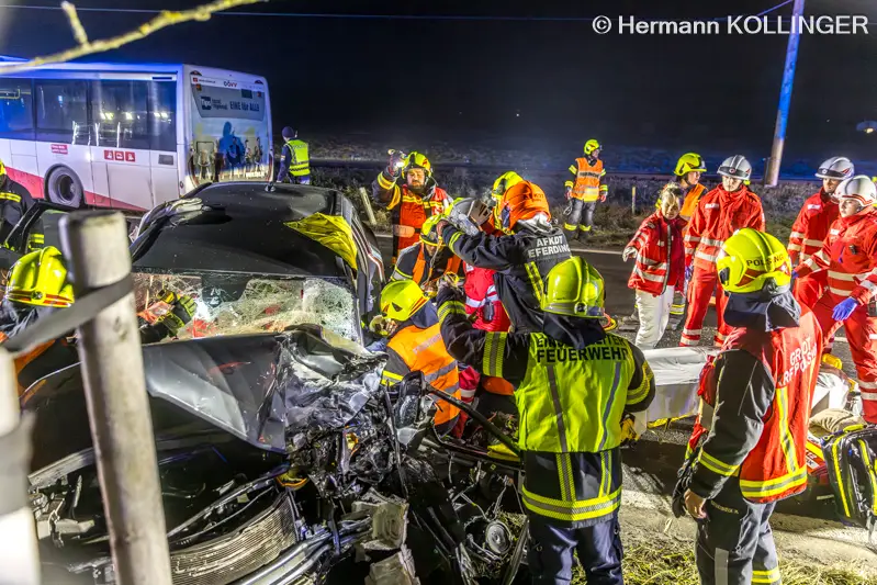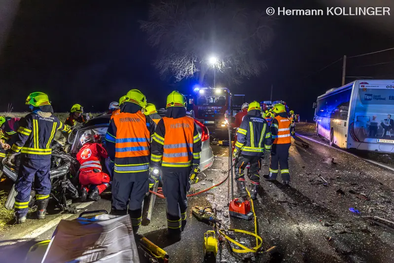 ALKOVEN (OÖ): „Schwerer Unfall, Bus gegen Pkw. eine eingeklemmte Person, mehrere Verletzte, Eferdinger Bundesstraße 129“ → das waren um 16.44 Uhr des Donnerstag, 4. Dezember 2025 die Alarmstichworte, die auf den Personenrufempfängern der Freiw. Feuerwehren Alkoven und Polsing zu lesen waren.