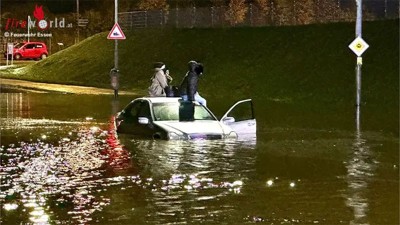 D: Überflutete Senke stoppt Limousine → Feuerwehr am Hafenstadion in Essen im Einsatz