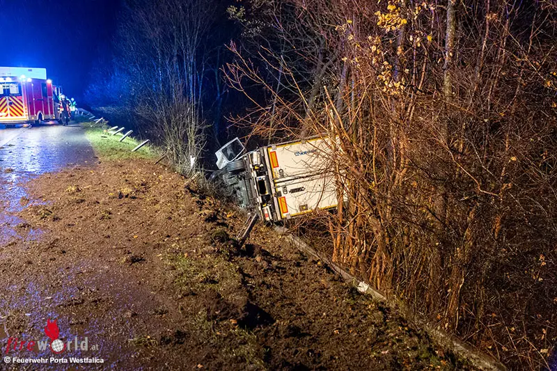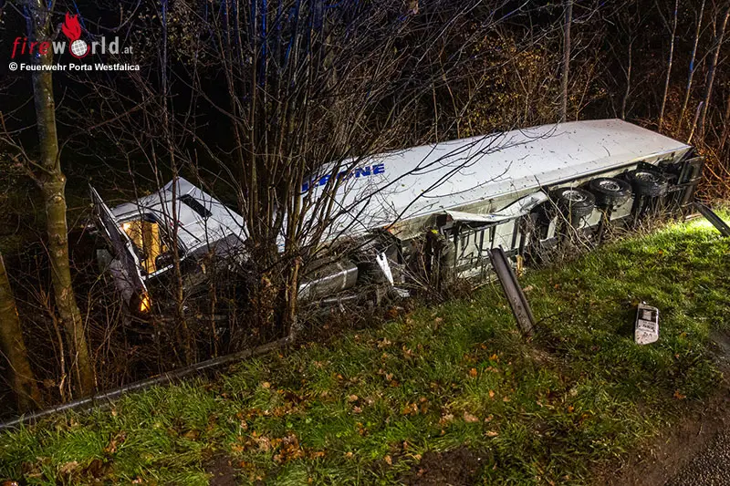 PORTA WESTFALICA (DEUTSCHLAND): Die Freiwillige Feuerwehr Porta Westfalica wurde am Sonntag, 7. Dezember 2025, gegen 22:13 Uhr einem schweren Verkehrsunfall mit möglichen eingeklemmten Person alarmiert. In Fahrtrichtung Dortmund hatte ein Lkw die Leitplanken durchbrochen und war eine Böschung hinabgestürzt. Dabei verletzten sich zwei Personen.