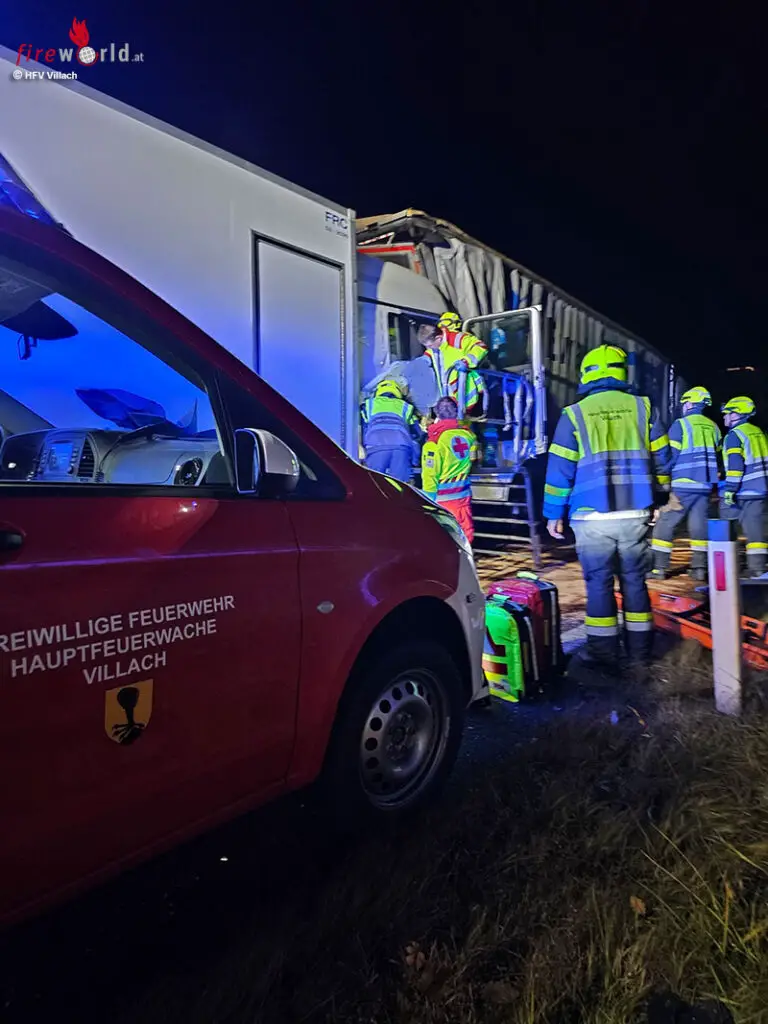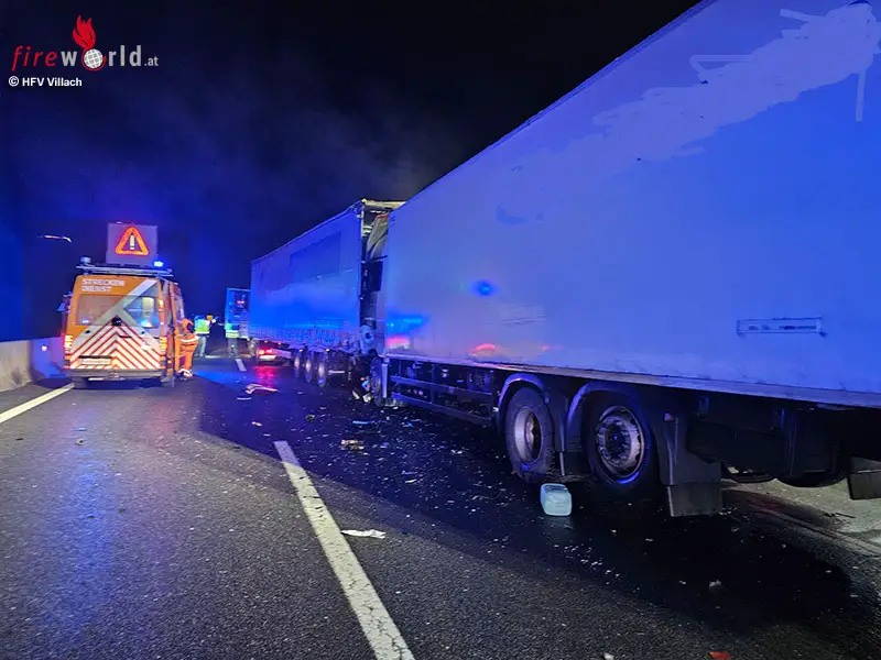 VILLACH (KTN): Kurz vor 04:30 Uhr des 8. Dezember 2025 wurde die Hauptfeuerwache Villach gemeinsam mit den Freiwilligen Feuerwehren Vassach und Töplitsch von der Feuerwehrleitstelle Villach zu einem schweren Verkehrsunfall mit zwei Lkw auf die A10 Tauernautobahn in Fahrtrichtung Knoten Villach alarmiert.